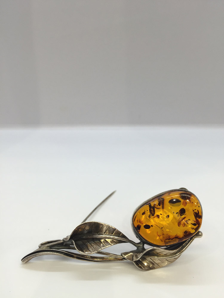 Ladies Sterling Silver, Amber, Flower Pin. 3 x 1 1/4