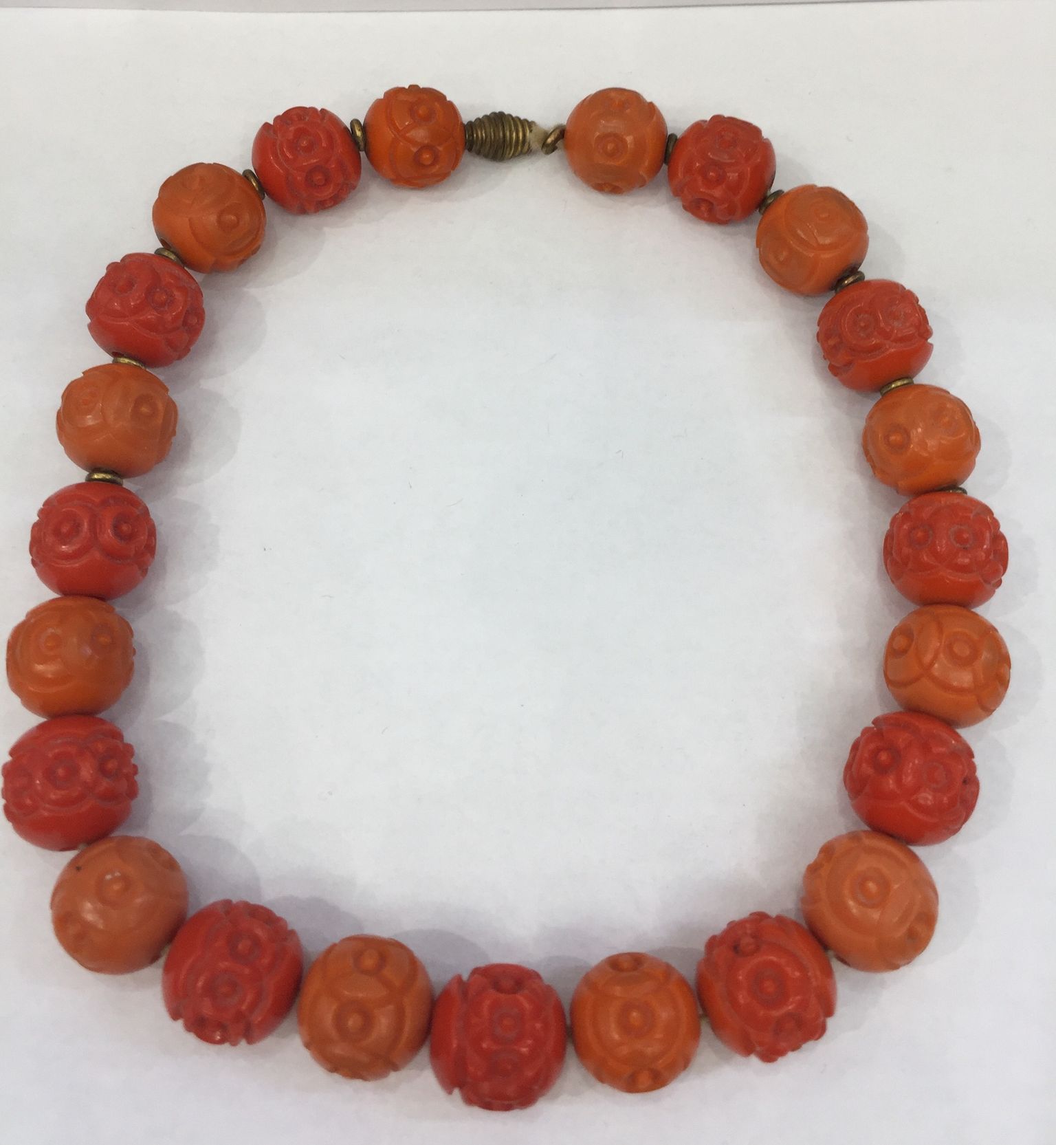 Ladies Faux, Carved Coral, Bead Necklace. 16 Inches.