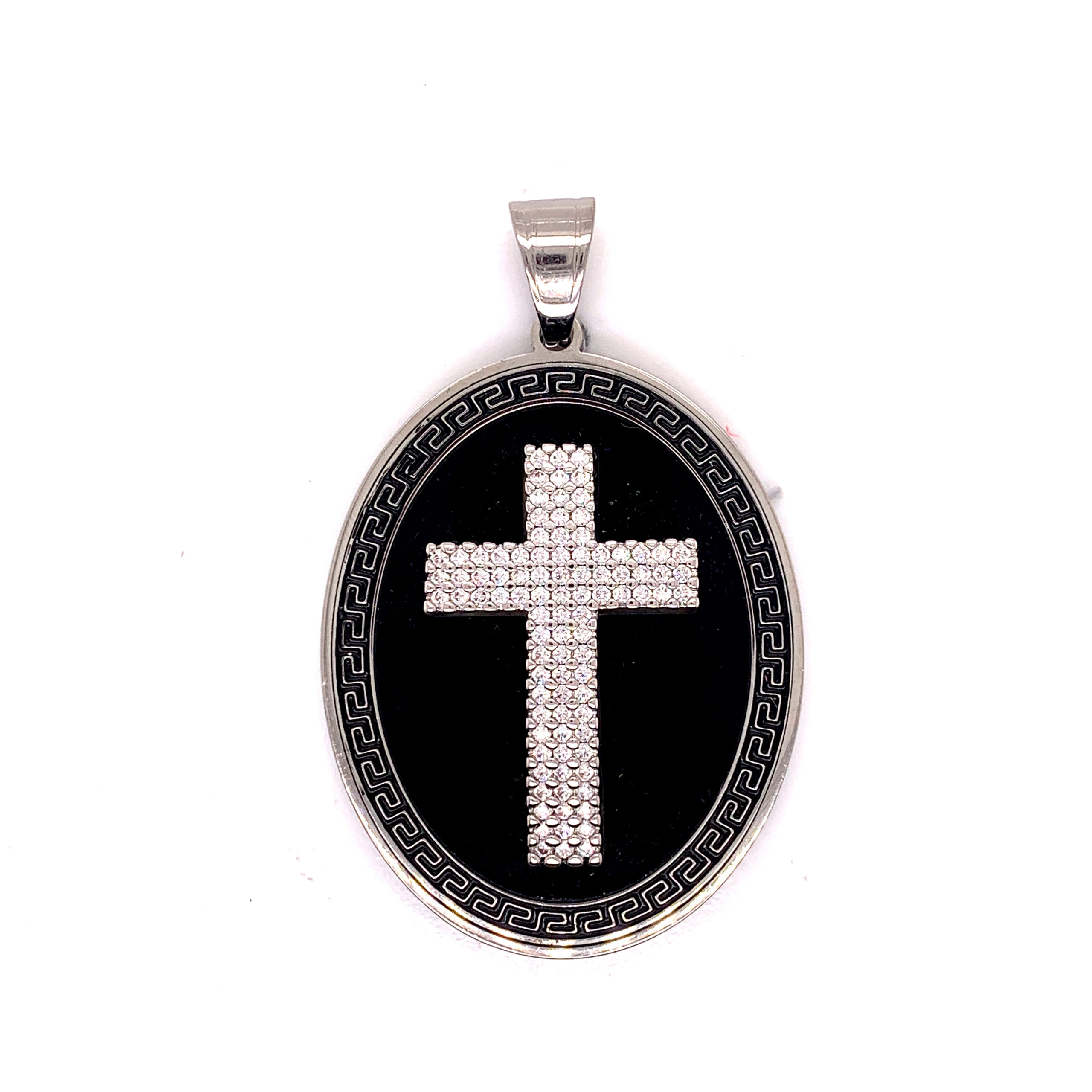 Mens Whitetone, Hiphop CZ Cross Oval Pendant With Black Enamel. 1 1/2 x 2