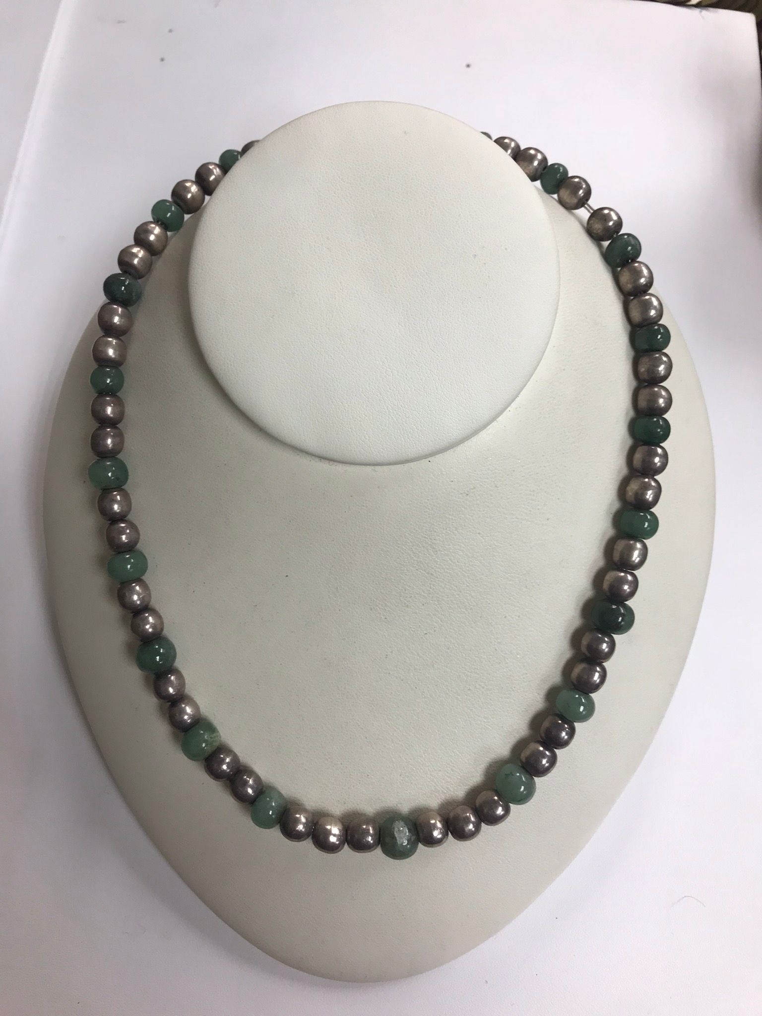 Ladies Sterling Silver, Faux Green Jade Beads. 20 Inches. (Mexico)