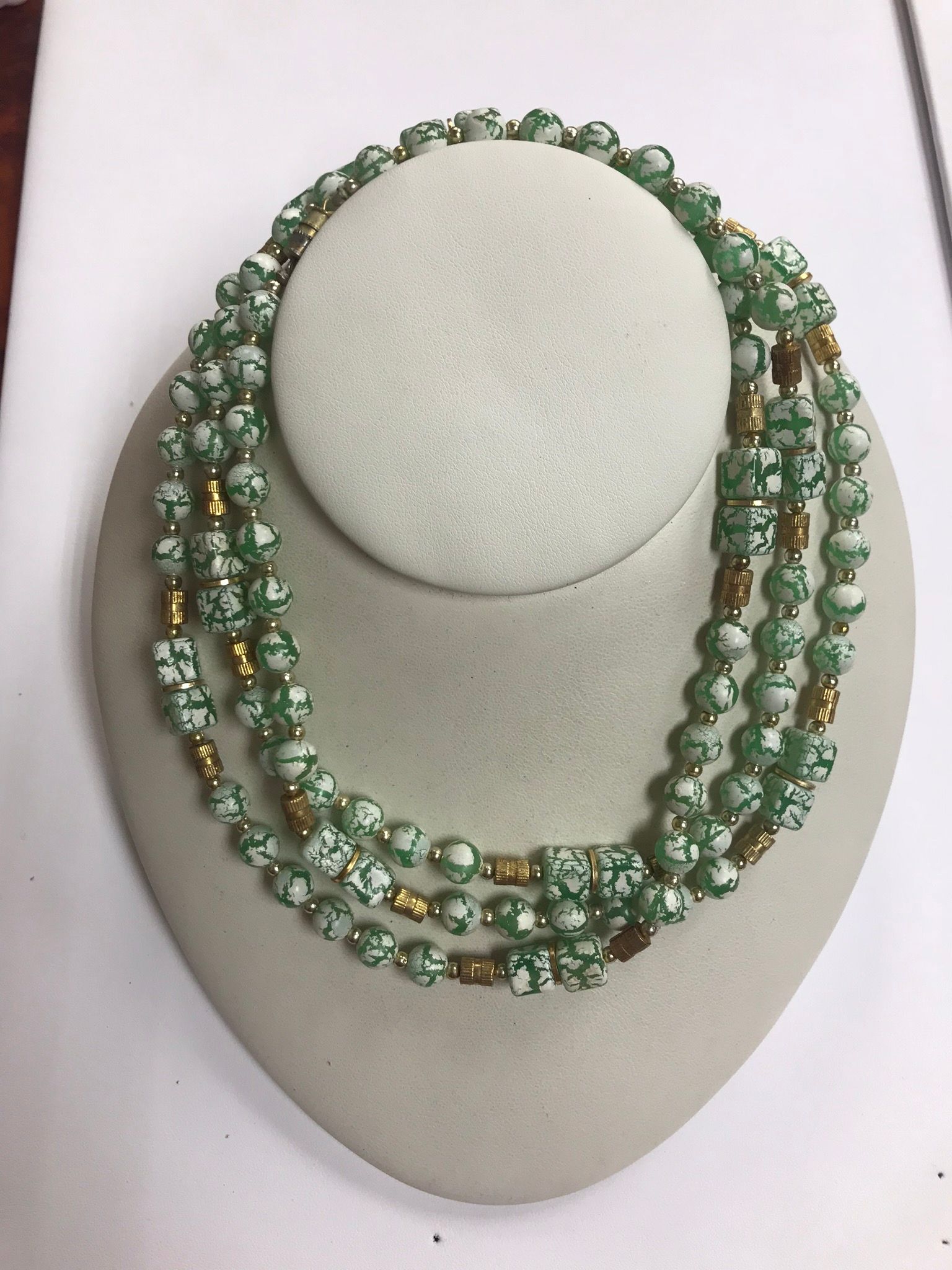 Ladies Green And White Glass Bead Chain, With Yellow Gold Beads. 24 Inches.