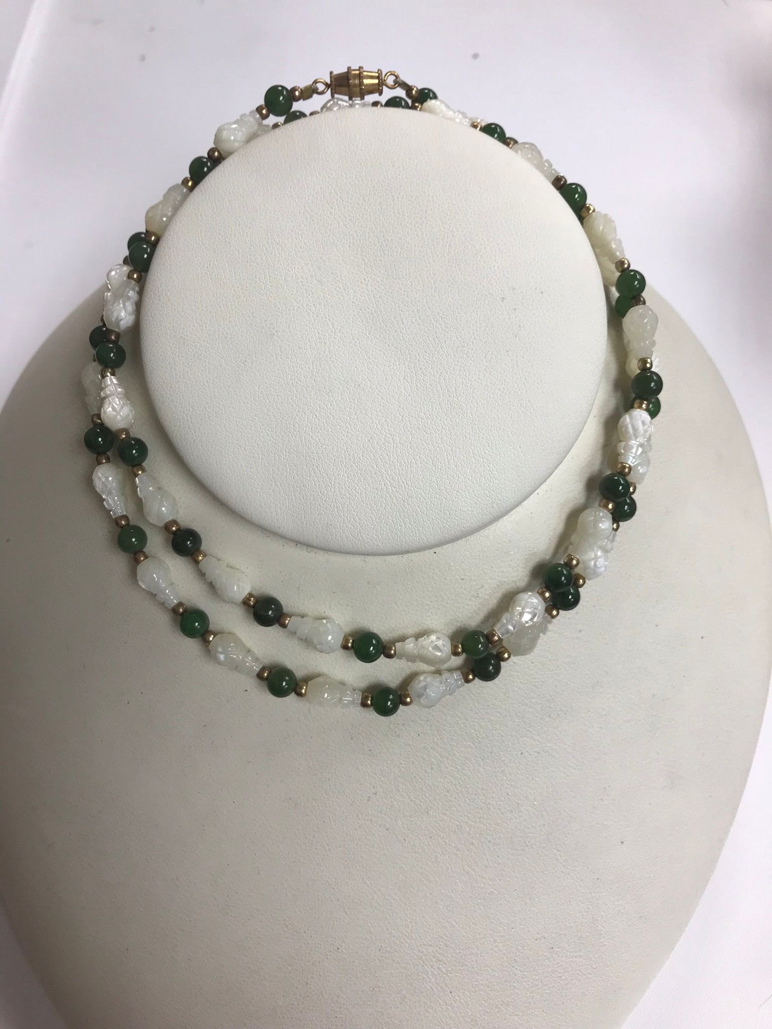 Ladies Yellowtone, Jade And Carved Mop Necklace. 20 Inches.